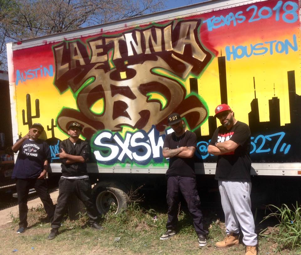 Kany, Ata, Kaiser y Esoh en Austin, Texas (USA). El último hizo el graffiti que está de fondo. Tomada del archivo de Facebook de La Etnnia.